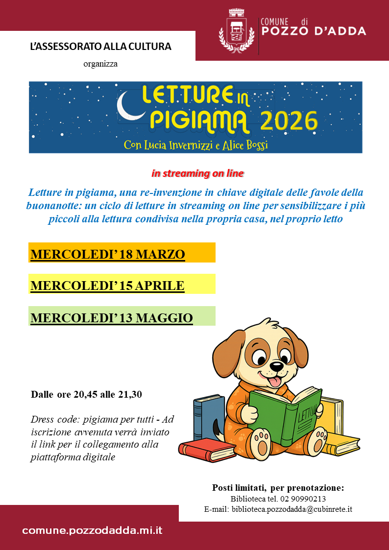 L’assessorato alla Cultura organizza, 'Letture in pigiama' - Mercoledì 18 marzo, Mercoledì 15 aprile e Mercoledì 13 maggio 2026 (dalle ore 20,45 alle 21,30) - ciclo di letture per bambini in streaming on-line.