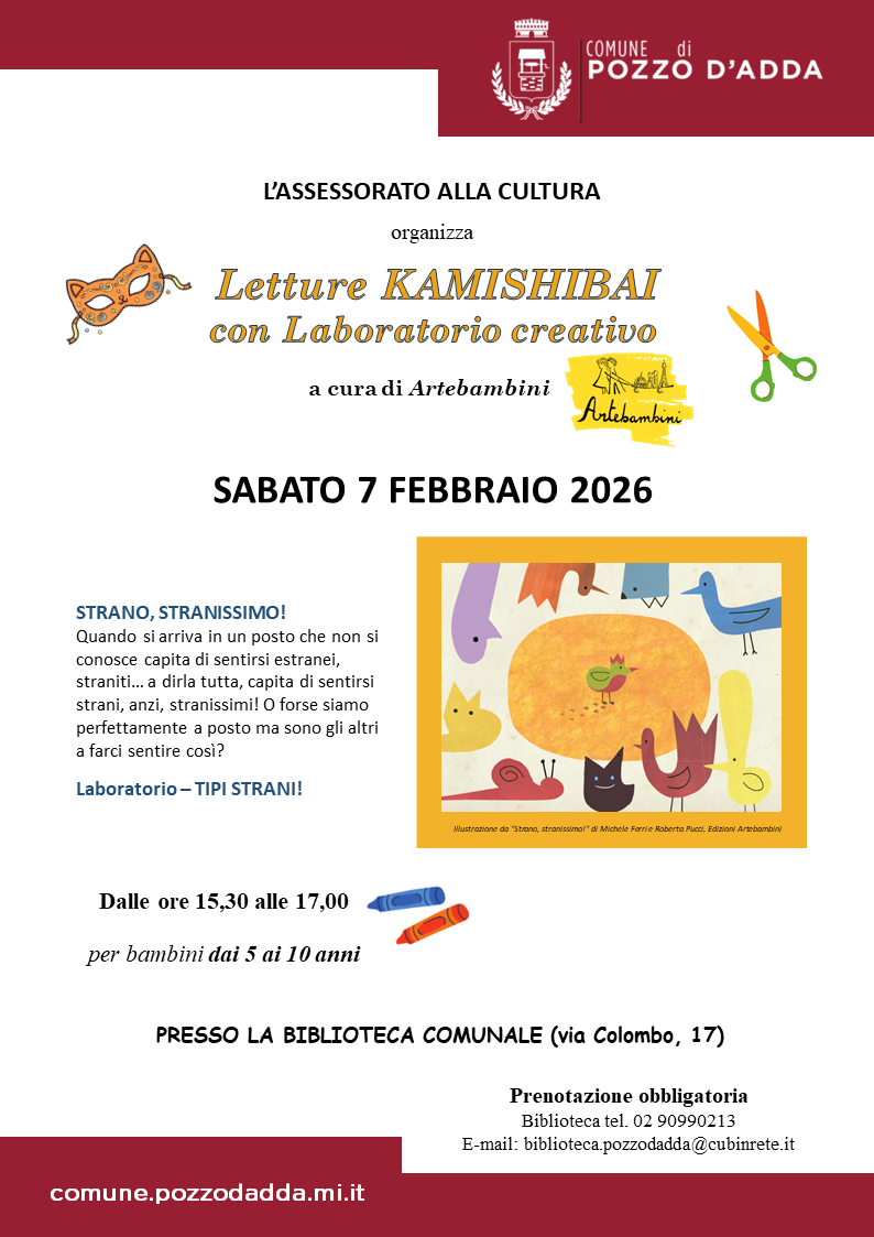 - Sabato 7 febbraio 2026 - Letture Kamishibai con Laboratorio creativo in biblioteca per bambini dai 5 ai 10 anni, dalle ore 15,30 alle 17,00.
