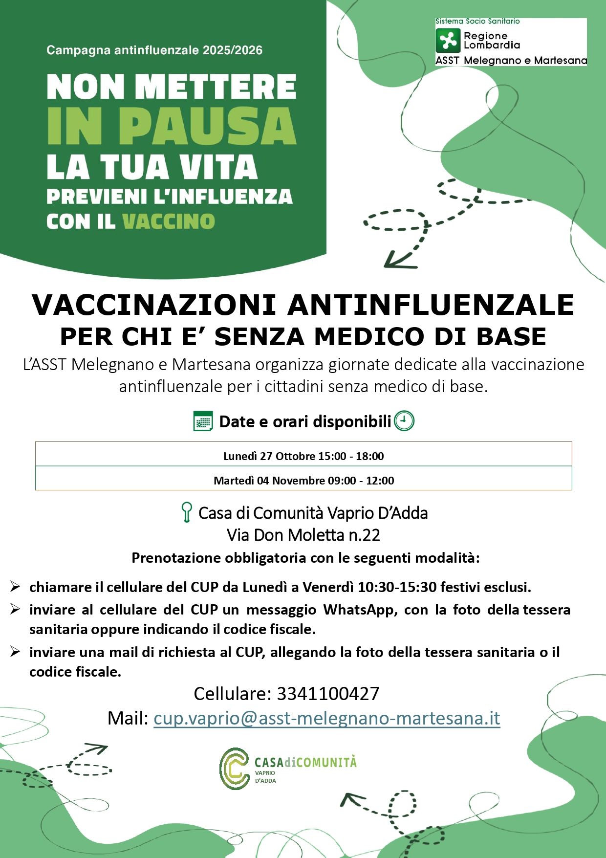 Testo completo title COMUNE DI POZZO D'ADDA Città Metropolitana di Milano Vaccinazione antinfluenzale per chi è senza medico di base - Casa di Comunità Vaprio D’Adda. L’ASST Melegnano e Martesana organizza giornate dedicate alla vaccinazione antinfluenzale per i cittadini senza medico di base, in programma Lunedì 27 ottobre e Martedì 4 Novembre c/o Casa di Comunità Vaprio D’Adda - Via Don Moletta n. 22. Per tutte le informazioni vedi l’allegato.
