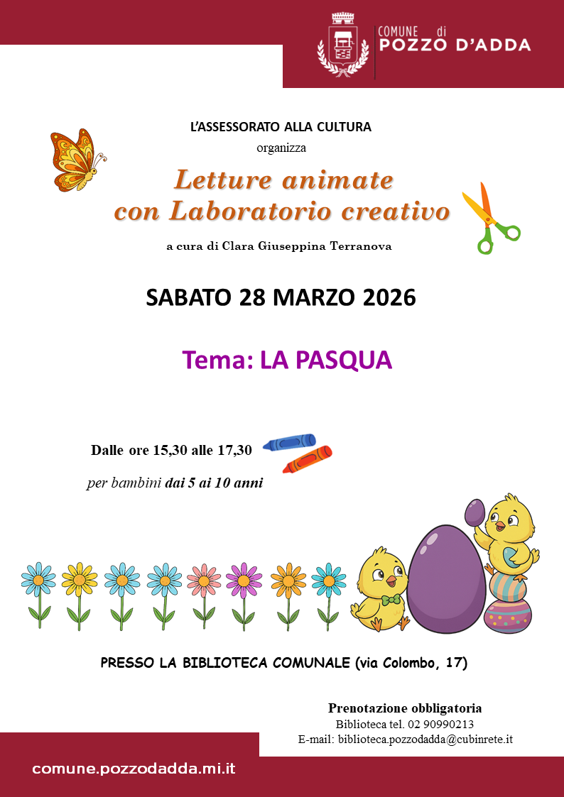 - Sabato 28 marzo 2026 - Letture con Laboratorio creativo in biblioteca per bambini dai 5 ai 10 anni, a tema 'La Pasqua', dalle ore 15,30 alle 17,30.