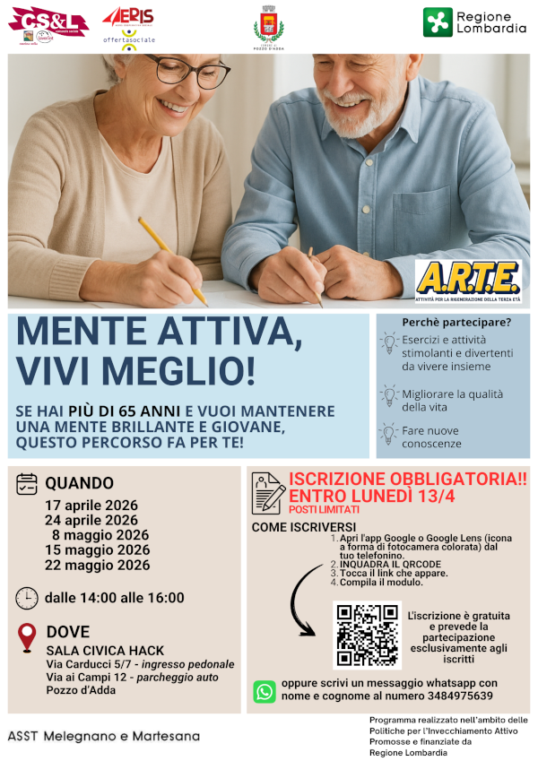 Dal 17 aprile 2026, una volta alla settimana per 5 incontri, presso la Sala Civica Margherita Hack, si terrà un percorso dedicato alle persone ultrasessantacinquenni, per mantenere la mente brillante e giovane.