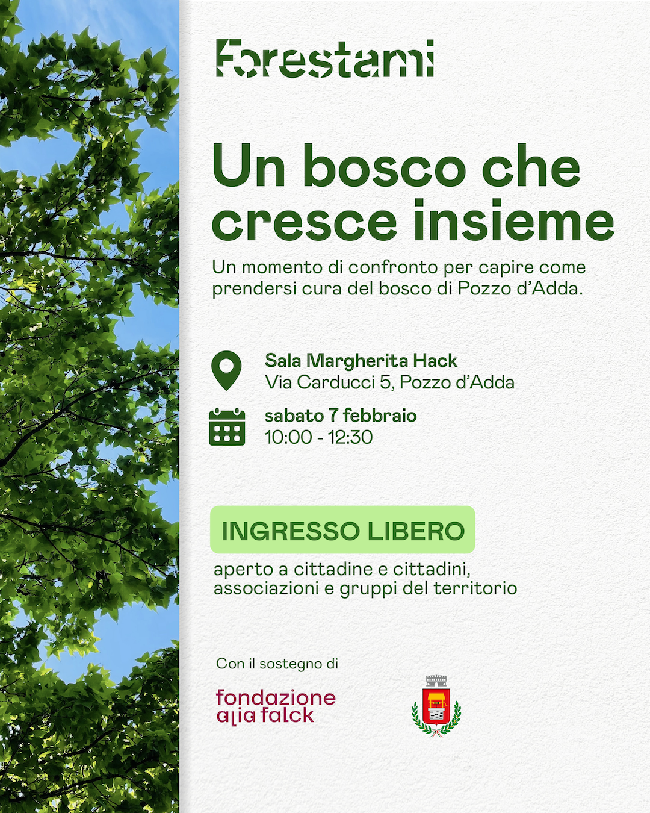 Testo completo title Un momento di confronto per capire come prendersi cura del bosco di Pozzo d'AddaSabato 7 febbraio ore 10.00 - 12.30 Sala M. Hack Ingresso libero. Aperto a cittadine e cittadini, associazioni e gruppi del territorio.Prossimi appuntamenti:In primavera, sperimenteremo insieme alcune attività nate dalla comunityIn autunno, scriveremo il manifesto del bosco di Pozzo d'Adda