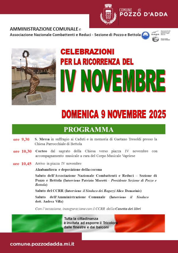 L'Amministrazione Comunale, in collaborazione  con l'Associazione Nazionale Combattenti e Reduci - Sezione di Pozzo e  Bettola, organizza le Celebrazioni per la ricorrenza del IV novembre.